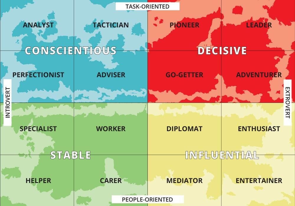 MapsTell is based on the DISC instrument (with the four well-known colours), but much further enriched by the extra visual layer. The power of this very detailed map is that the metaphor of cities, mountains and rivers immediately invite participants to discover their place in the world. It is even more fun when the positions of your colleagues also come into view and you can travel together to an even stronger team. Watch the short introductory video: